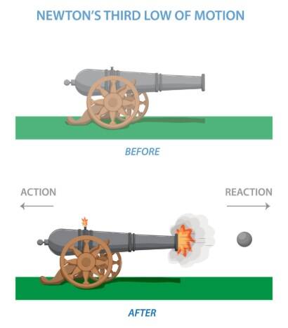 Derde wet van Newton: Als een voorwerp A een kracht F op een voorwerp B uitoefent, gaat deze kracht gepaard met een even grote, maar tegengesteld gerichte kracht F” van B op A: