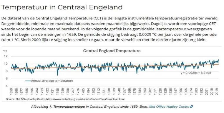 In bovenstaande grafiek zien we een lichte stijging van de gemiddelde temperatuur. Hoe nauwkeurig deze metingen zijn, dient eerst te worden onderzocht. Zo is de temperatuur in stedelijk gebied op een zonnige dag altijd hoger dan in ruraal gebied. U kunt niet ongestraft uitgaan van bovenstaande data.