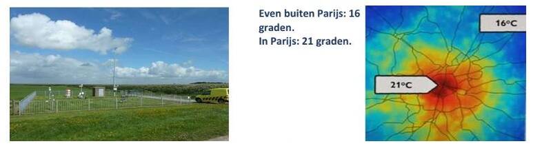 - In steden meer zonlicht wordt geabsorbeerd dan in omliggende gebieden door de daar aanwezige, donkere materialen, zoals asfalt;